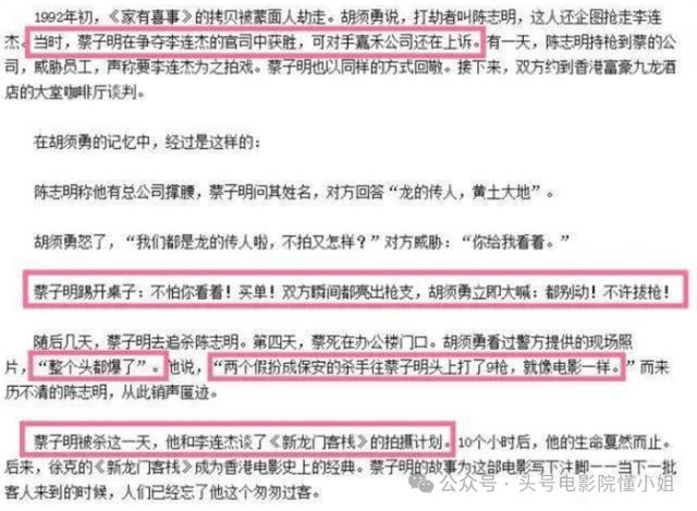 后边蔡子明帮李连杰讲了一部《新龙门客栈》,原定李连杰出演周淮安,定妆都拍了,结果,蔡子明出事了。