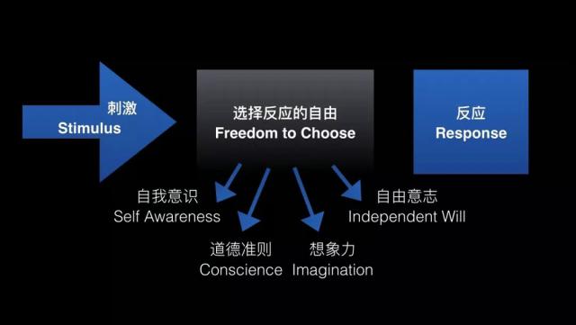 人类之所以不同于动物,是因为人类在“接受刺激”和“给予反应”之间有一种自由。(Freedom to Choose)。我们之所以有这样的自由,是因为人们有自我意识,有想象力,有道德,有自由意志。