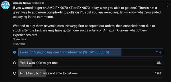 Gamers Nexus 还有一项调查,共投票 14.3 其中一万人居然只有 10%购买新卡,19%试了一下却买不到。