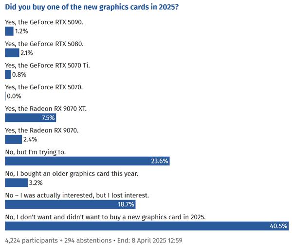 德国的 ComputeBase 做了一项调查,问大家买新卡的情况,总共有一些, 4219 人们参与,在德国这也不算少。