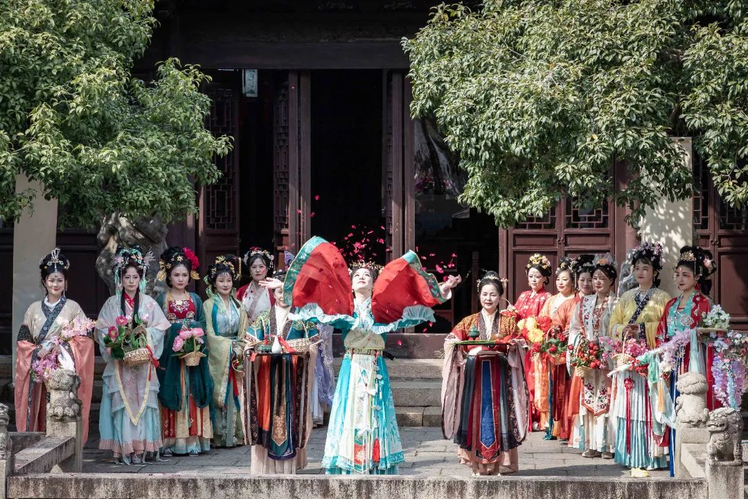 当天下午,静安区北站街北舞华汉舞团的舞者扮演“十二月令花仙”的角色。舞者们穿着华丽的彩色衣服,戴着发夹,手里拿着花篮,从雪海堂慢慢走进庭院中央。随着音乐的兴起,“兰花之神”和“花仙子”一起翩翩起舞。轻盈的舞蹈就像春风吹过柳枝,蝴蝶穿梭在花丛中,仿佛把春天的气息和活力带到了江南园林的每一个角落。“我觉得这个活动很有意思,可以让大家了解花朝节的文化习俗,更能感受到江南园林的美景和人文浪漫。”一位游客边拍照边说。