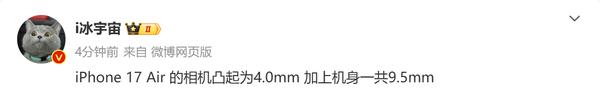 曝 iPhone 17 Air 相机凸起达 4mm 身体最厚的部分是 9.5mm