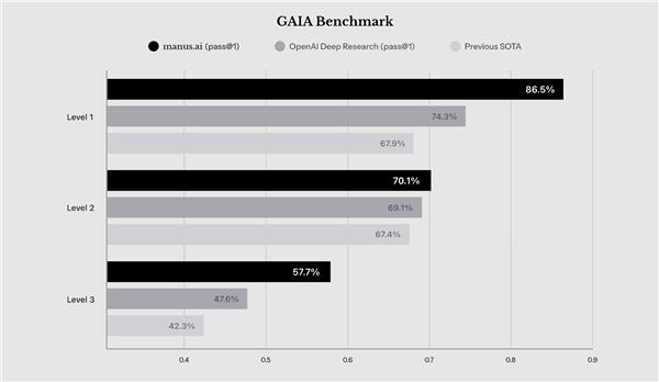 根据团队的介绍,Manus 在 GAIA 在基准测试中获得 SOTA(State-of-the-Art)结果表明其性能超越了 Open AI 同级大型模型。