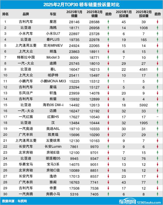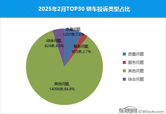 根据乘联会提供的全国汽车产销数据,2025年 年 2 当月,国内汽车市场累计零售销售。 66.3 万台,环比下降 同比增长19.7% 33.1%。与此同时,车质网受理车主对汽车的有效投诉 24,311 宗,环比上升 同比增长294.3% 128.1%。2025年,在清除投诉人自愿申请撤诉的信息后, 年 2 月 TOP30 汽车销售投诉数量排名如下: