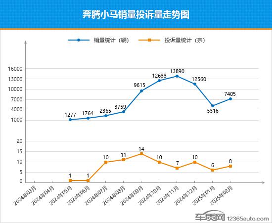 进入 2025 2008年,奔流小马的市场表现开始低迷,正在经历。 1 月度销售触底后,2 月度销售开始回升,环比上升。 在微型汽车销售排行榜上,39.3%稳居前列。从近一年的销售投诉数量走势来看, 2024 年 5 本月上市后,奔流小马的市场表现平平,从第四季度开始上涨,连续三个月销售额突破万元,可见其已经得到了市场的初步认可。另一方面,奔流小马的月度投诉表现,整体走势相对稳定,1 月份和 2 每月投诉数量保持在个位,短期口碑表现良好。就投诉销售比例而言, 2 每月投诉销售比例环比略有下降,投诉销售比例呈现出向好的趋势。随着奔流小马车型的不断更新和中国新旧置换的优惠政策,入门门槛进一步降低,有望吸引更多潜在客户的关注。值得期待的是,未来能否真正成为“黑马”。