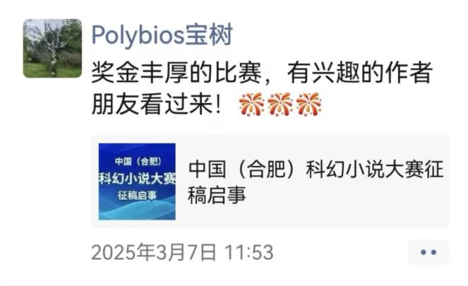 比赛也引起了韩松、宝树、吴岩、马传思、苏青等著名科幻艺术家的高度重视。他们一个接一个地分享征文的通知,一致认为科创名举办科幻小说比赛是时候了。科幻文学敢于率先发展的精神,能更好地体现合肥的气质,有利于拉动合肥的科创文化品牌。接下来,他们还将接受记者的采访,与科幻迷分享他们的爱,交流他们的想法。