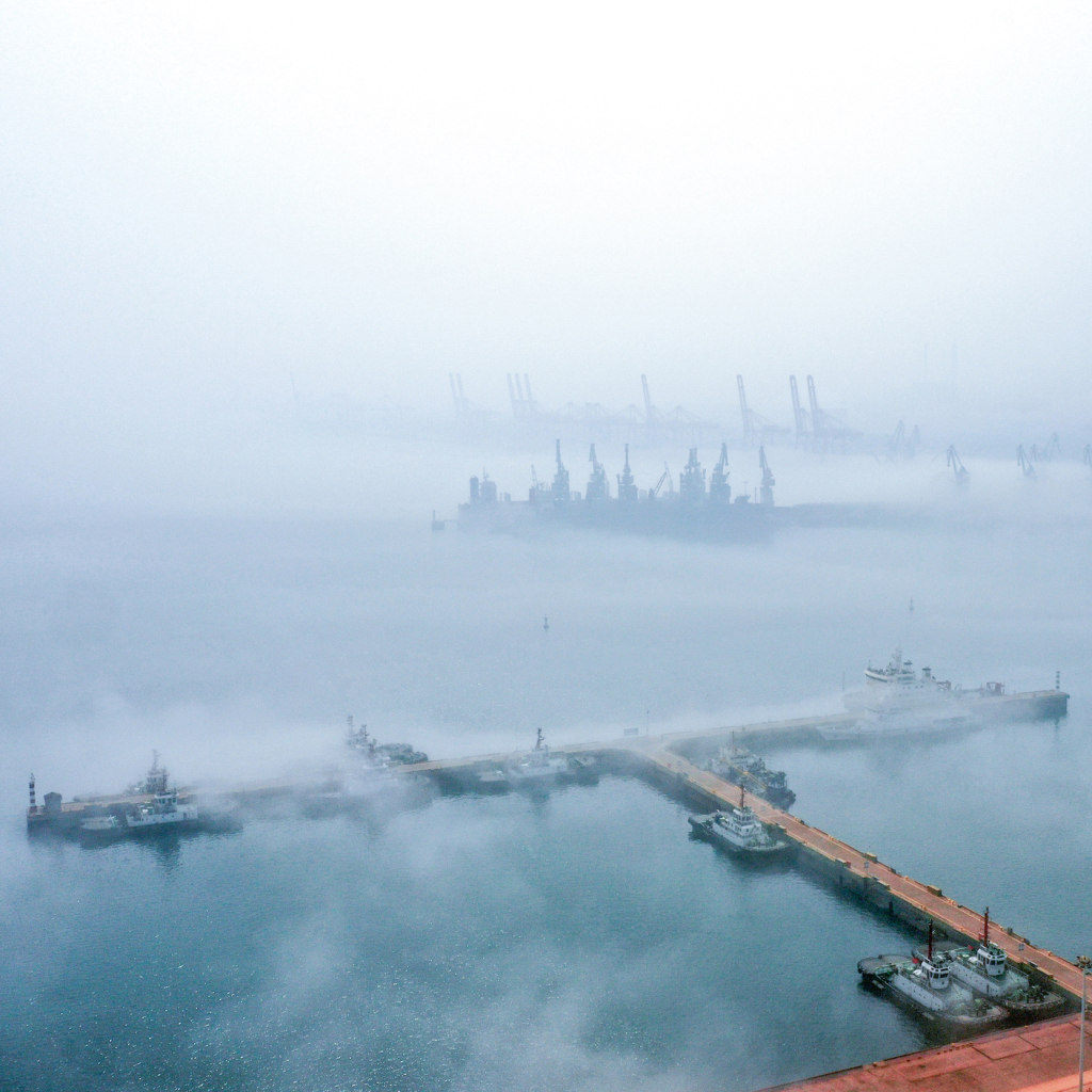 三月十二日,山东日照,一场平流雾把港口装扮得像仙境,门机、桥梁、巨轮在雾中若隐若现。