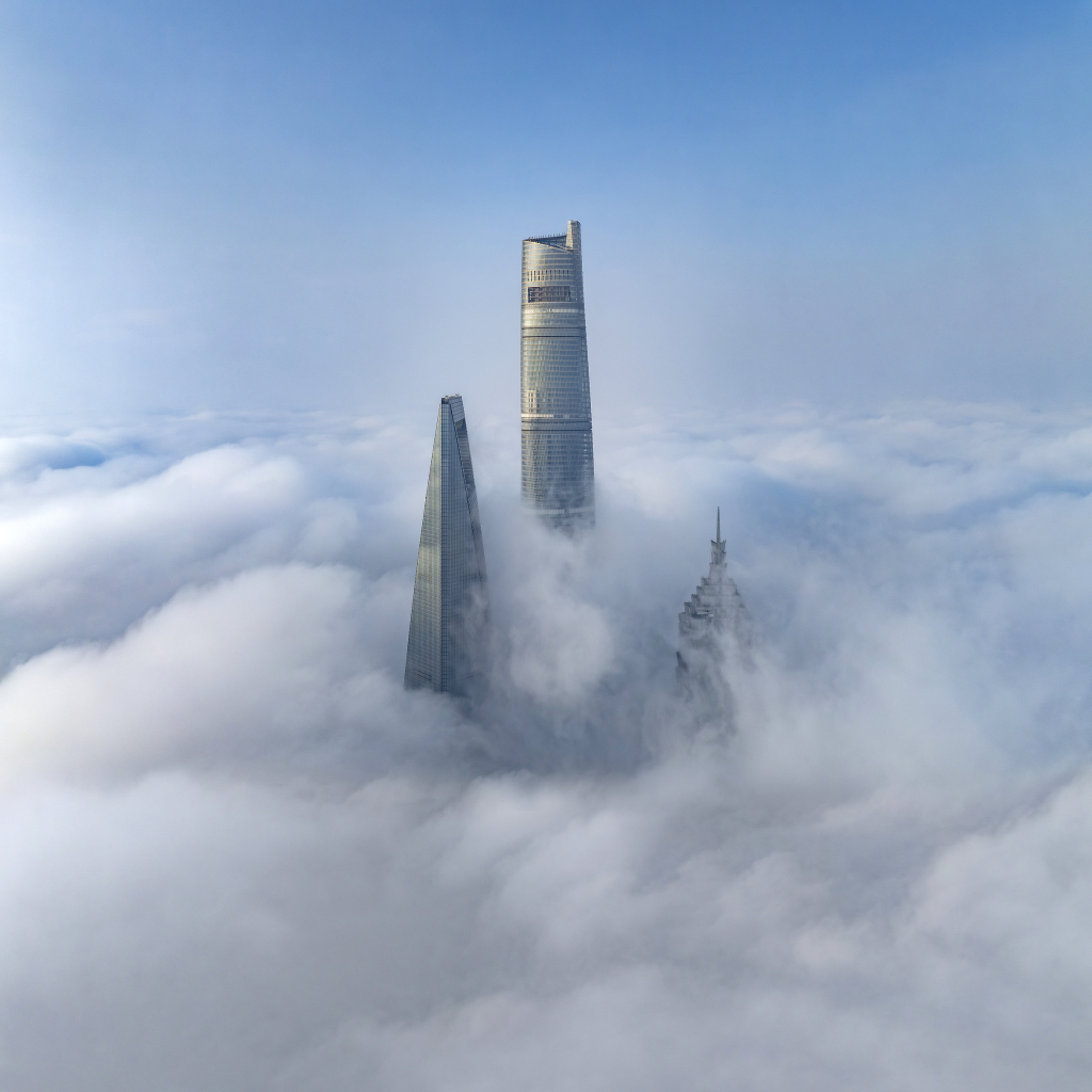 三月十一日,上海陆家嘴三件套被平流雾包围,犹如海市蜃楼。
