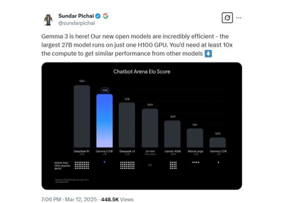 【CNMO 技术新闻:谷歌CEO日前 Sundar Pichai 宣布开源最新多模式大模式 Gemma-主要推广低成本和高性能。Gemma-3 提供四种不同参数的规模版本, 10 亿、40 亿、120 亿和 270 亿参数。即使是参数最多的 270 在1亿版本中,只需要一个 H100 高效推理可以通过显卡来实现。相比之下,如果同类模型想要达到类似的效果,至少需要改进。 10 倍算率。因此,Gemma-3 这是目前性能最强的小参数模型之一。