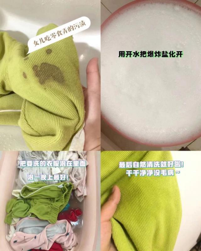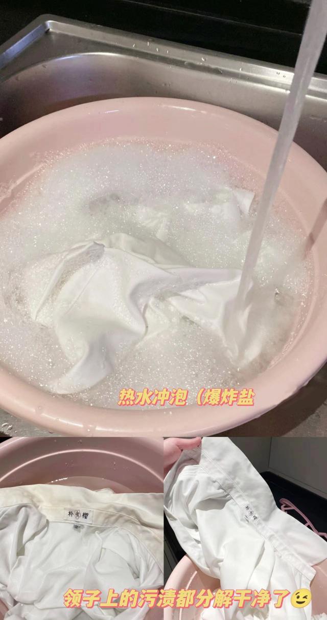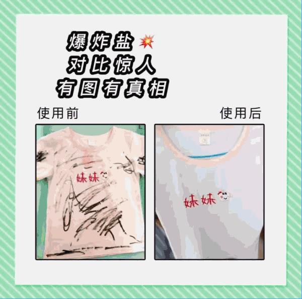 儿童校服上的钢笔水,火锅油迹,丈夫的衬衣领口,袖子发黄,用“ 60 ℃热水 2 勺 浸泡在爆炸盐粉中 30 分钟,污垢肉眼可见变淡,再放入洗衣机正常机洗,衣服柔软,就像换了一件新衣服!连买新衣服的钱都省了!