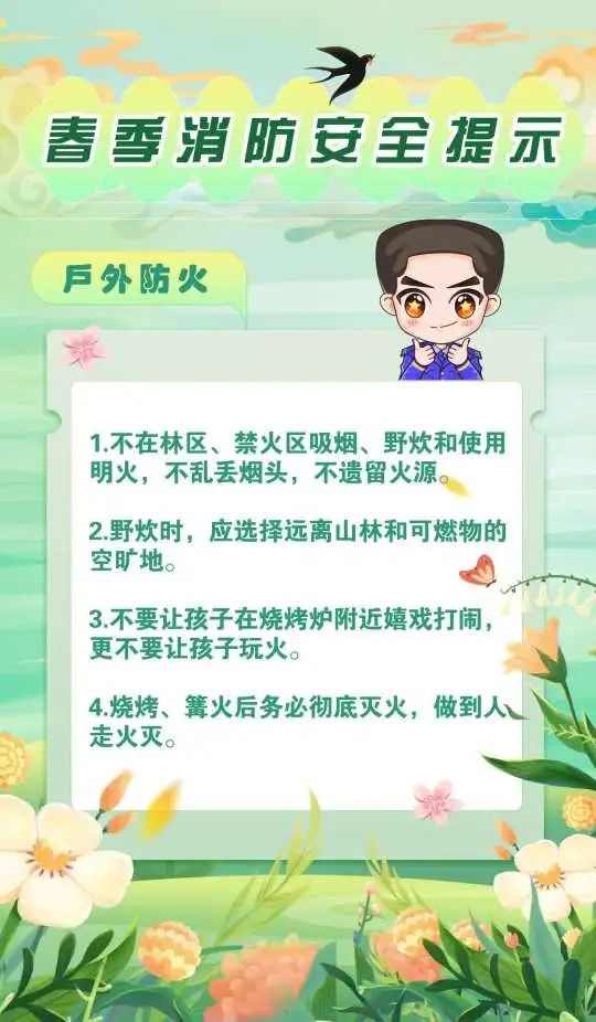 随着清明节的临近,扫墓时要注意火灾安全,提倡文明扫墓,尽量选择花卉、植树等环保方式。如果你需要烧纸钱,选择一个开放的地方,然后在明火完全熄灭后离开。春耕季节,农业用火频繁,要注意远离易燃物质,不要随意焚烧秸秆、杂草等。,以免引起火灾。同时,消防部门建议,每天多学习消防安全知识,掌握逃生自救技能,在紧急情况下正确处理。