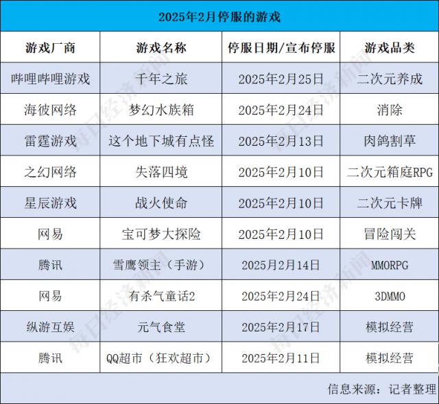 最近,《国家商报》旗下的游戏洞察栏目“ NBD “深度复盘”游研所 2 每月停止服务游戏名单。每日经济新闻记者查看游戏官方微博,TapTap 官方账号、游戏官网等方式不完全统计发现,2025 年 2 每月宣布停止运行和正式停止运行的游戏超过 10 款。