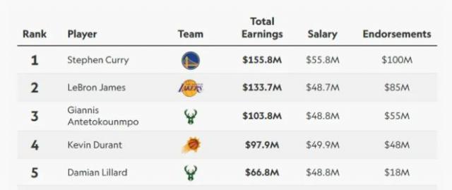 在过去的一年里,服役 NBA 球员总收入排名第一 3-5 字母哥依次(1.038) 亿美金)、杜兰特(9790 万美元和利拉德(6680 万美金)。