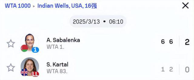 北京时间 3 月 13 一天早上,WTA1000 印第安维尔斯站女单 1/8 决赛结束了一场比赛,头号种子萨巴伦卡为了两场比赛直接落下。 6-1、6-2 卡塔尔,一个幸运的输家,昂首挺进八强,然后等待保利尼。 VS 胜利者在萨姆索诺娃之间。