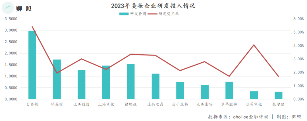 因为,这种与R&D一起外包的委托生产方式(ODM),虽然在一定程度上为丸美节省了R&D费用,但去年丸美在上市美容企业中处于垫底,无论是6229万元的R&D费用总额还是2.8%的R&D费用率。