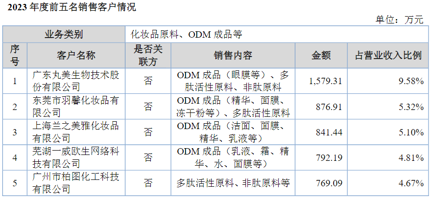 虽然企业财务报告没有直接披露自主生产与委托代工的比例,但去年的一份IPO申请稿揭开了丸美产业链的秘密:2024年12月,维琪科技提交了招股书,其中丸美在大客户中排名第一,采购金额连年上升。2023年,维琪科技盈利9.58%。除了活性原料,采购产品还包括眼罩、面霜等核心产品的ODM产品。
