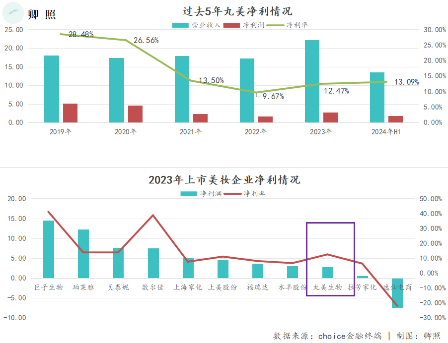 但是市场给出的正反馈却越来越少,丸美四年营业收入从18.01亿元增长到23.6%到22.26亿元,净利润从5.13亿元减少到2.78亿元。尤其在同行业企业中横向比较,丸美现阶段净利润水平也处于低谷。