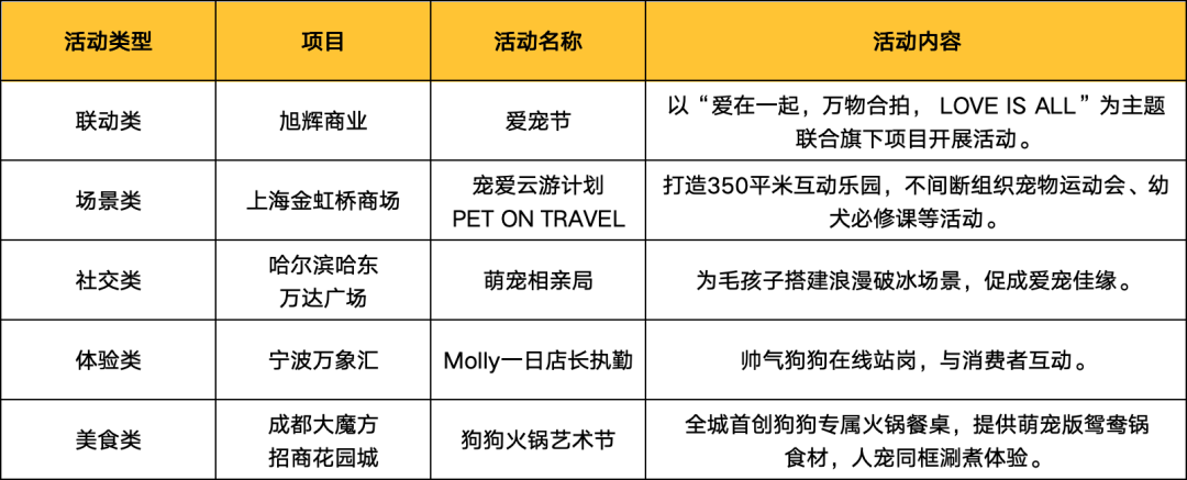 与过去的美陈打卡、宠物市场等其他方式相比,宠物活动在空间大小和内容延伸方面发挥了更多的作用。互动性高的宠物活动,如宠物相亲、宠物火锅等,越来越普遍。