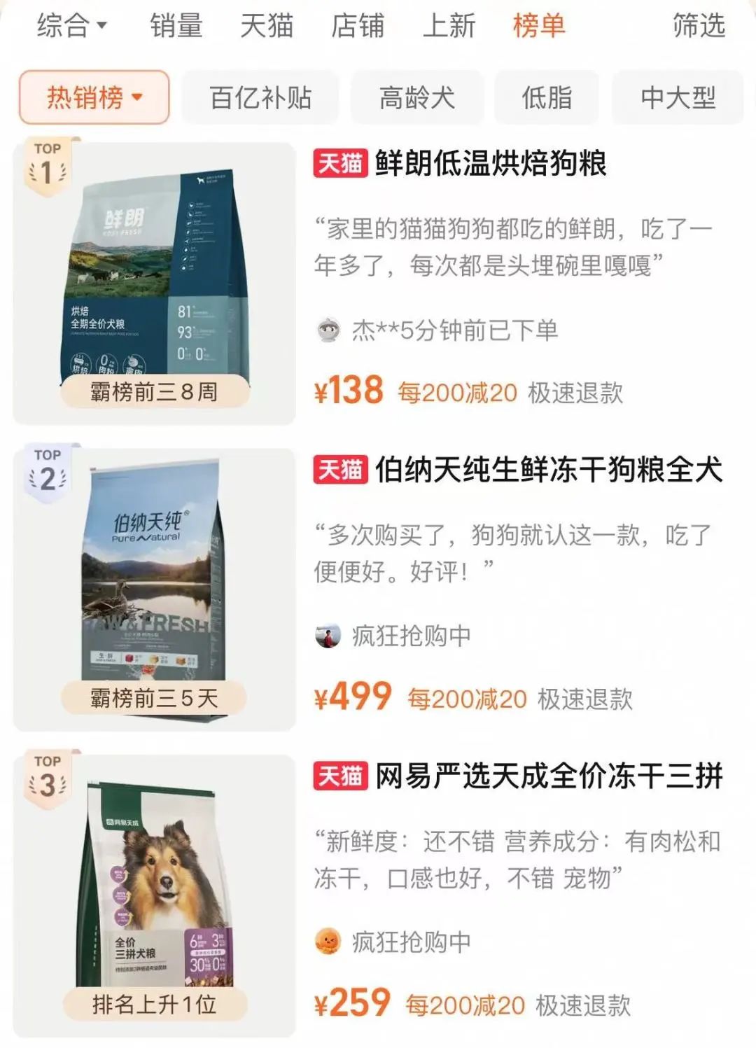 首先,在饮食方面,我们改变了过去被外资宠物品牌垄断的局面。近年来,以营销成分高、性价比高为主的国产品牌开始受到更多关注。淘宝狗粮畅销榜前三名都是国产品牌。