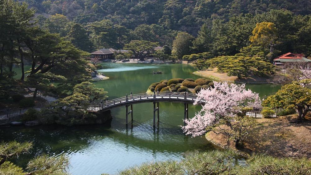 高松市栗林公园以樱花闻名,园内樱花与古典园林景观相得益彰。