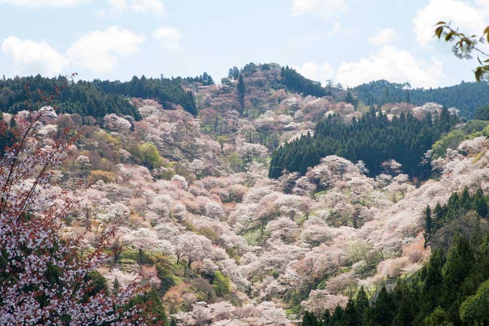 奈良的吉野山被选为日本第一樱花胜地,以“千本樱”而闻名。山上种植了约3万棵樱花树,分为四个区域:“下千本”、“中千本”、“上千本”和“奥千本”。樱花从低海拔的山脚依次绽放到高海拔的山顶,大约有一个月的赏花期。