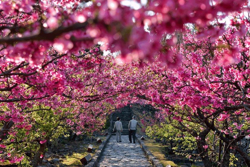 冲绳樱花作为樱花线的起点,最早开放,著名护城遗址的樱花代表着春天的开始。
