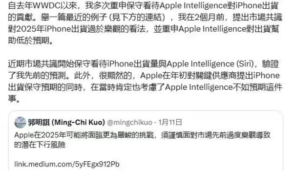 早在去年 7 月份,郭明邈曾经说过,市场对立 Apple Intelligence 推动 iPhone 升级预期可能“过于乐观”。今年 1 月亮,他进一步指出,因为苹果在 6 月展示 Apple Intelligence 功能和 10 每月正式推出之间存在延迟,其吸引力已经“明显下降”。