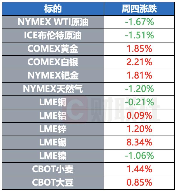 COMEX 黄金期货收涨 1.85%,报 3001.3 美金 / 盎司;COMEX 白银期货收涨 2.21%,报 34.49 美金 / 盎司。
