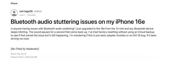 一位用户发帖称,他从 iPhone 13 mini 升级到了 iPhone 16e,当手机连接蓝牙设备时,声音会卡住,即使出厂设置恢复,问题依然存在,这是一种崩溃。