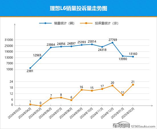 自 2024 年 4 月亮上市后,理想 L6 市场表现一度锐不可当,不到 1 每年,累计销售已经突破。 20 万台。但是,进入 2025 年后,理想 L6 销售业绩开始下滑,2 月度销售额下降到近半年来的最低点。归根结底,理想 L6 在 25-30 一万元的市场竞争力并不突出,这个价格区间的新能源车型中有很多实力雄厚的玩家,比如问界。 M7。从其近一年的销售投诉量走势可以看出,在销售稳步前进的同时,投诉量呈上升趋势。2 月度投诉量再创新高,环比上升。 口碑表现不容乐观,90.9%。根据汽车质量网络数据,理想 L6 投诉多集中在“辅助驾驶系统故障”上,部分车主反映,在驾驶过程中,智驾系统出现错误判断,造成交通事故。但是结合销量来看,2 月理想 L6 投诉销售比值虽然比值更大 1 每个月都有明显的增长,但仍然保持在合理的范围内,投诉销售比例体现在榜单车型中处于中上游水平。从短期来看,理想 L6 只要口碑问题得到妥善处理,市场表现就有机会迎来反弹。