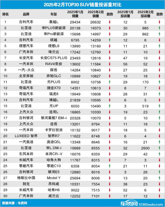 根据乘联会提供的全国汽车产销数据,2025年 年 2 月份国内 SUV 零售销售的市场累计 66 万台,环比下降约 同比增长25.8% 21.1%。与此同时,车质网受理车主针对车主 SUV 的有效投诉 15,360 宗,环比上升 同比增长184.3% 237.7%。2025年,在清除投诉人自愿申请撤诉的信息后, 年 2 月 TOP30 SUV 销售投诉数量排名如下: