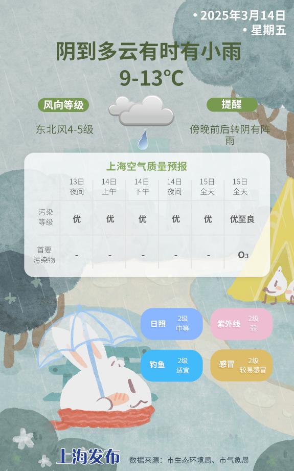 今天阴天有时下小雨,晚上阴天有阵雨。东北风4-5级,临江沿海城市阵风6级。9-13℃,相对湿度为50%-95%。主要降雨期为今晚到晚上,明天下午到半夜,期间可能伴有弱雷击。