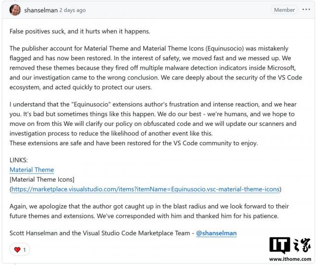 随后微软承认了错误,恢复扩展,并承诺改进扫描和调查过程,避免类似事件再次发生。Scott Hanselman 表示: