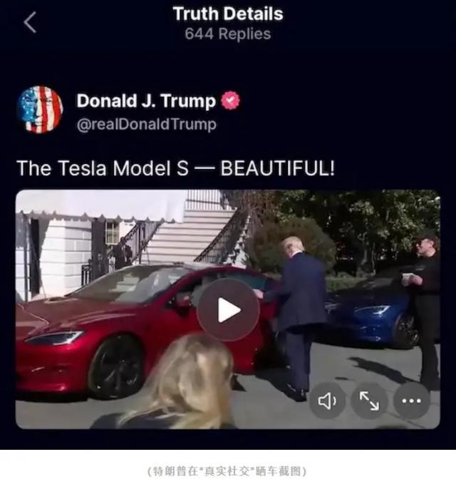 特朗普作为马斯克忠诚的盟友,随后在社交媒体上“真实社交”(Truth Social)为了支持马斯克,他高调宣布将购买一辆全新的特斯拉。随后,马斯克在社交媒体上 X 上面的回应,感谢特朗普的支持。
