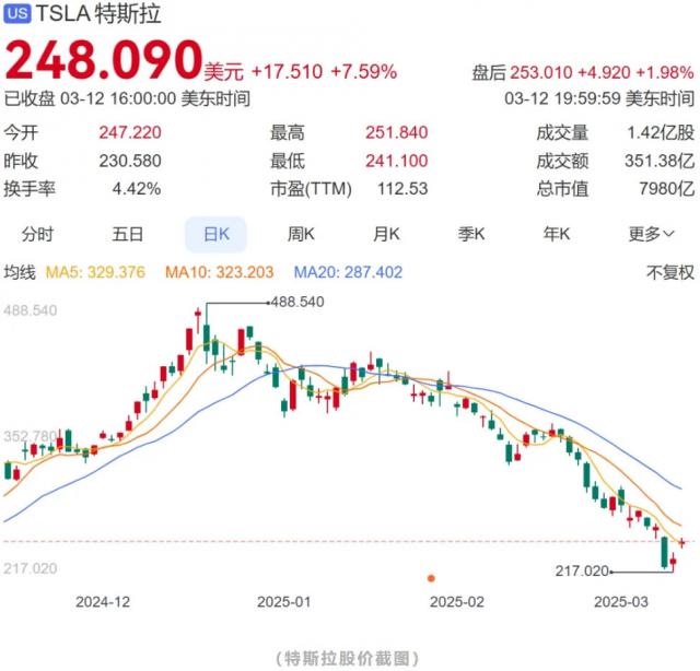 特斯拉股价在接下来的两个交易日迎来反弹。到美东时间为止 3 月 12 日,收盘时涨幅为 最新收盘价7.59% 248.09 美金。然而,在前一个交易日,里特斯拉的最低股价一度达到。 217.02 从去年开始,美金继续创出 12 月 18 日至今的新低。这个价格也基本回落到去年。 10 月 23 每日市场即将开始时的水平。