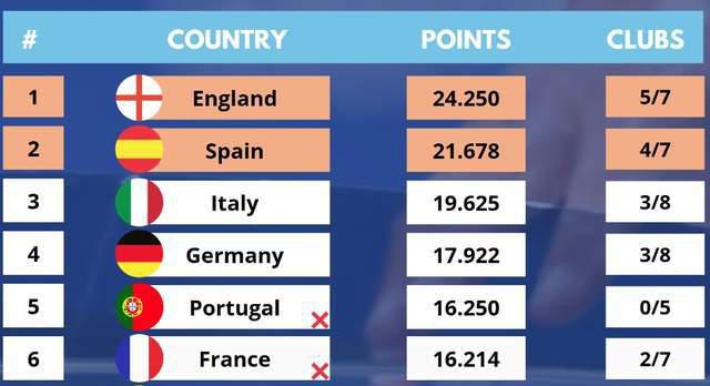 2024-25 在这个赛季,英超的欧战积分达到 24.25 分高居第 1 位,西甲 21.678 分,意甲 19.937 分数。欧战积分之前 2 国家联赛,将获得额外的联赛。 1 一个欧冠席位,英超已经甩掉了意甲。 4.3 分数,基本锁定前 2!