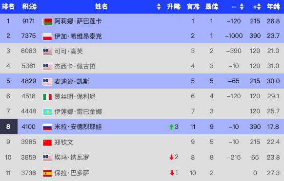 因此,安德列娃也超越了郑钦文,来到了世界第一。 8 位置,刷新自己的位置 WTA 最好的排名。而且郑钦文和纳瓦罗、巴多萨在他们身后也只差不多。 100 多与 200 更多的分数。郑钦文将面临跌出世界 10 的风险。