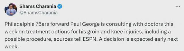 Shams:乔治将与医生讨论如何治疗腹股沟和膝盖损伤,并可进行手术。