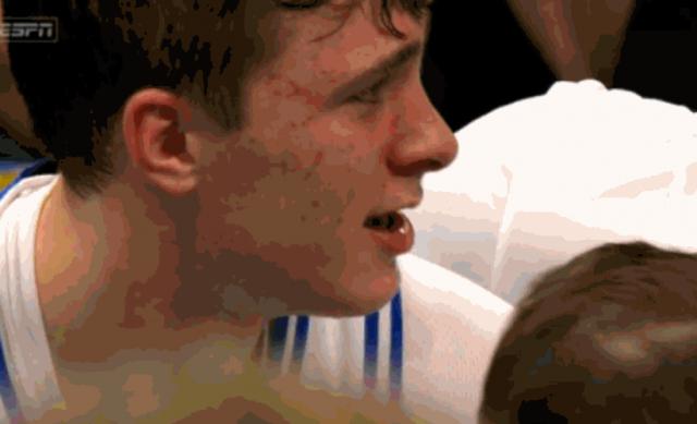 作为 ACC 弗拉格一瘸一拐地回到替补席上,这是年度最佳球员和年度最佳新人。显然,他非常痛苦。他双手放在座位上弯下腰,用右拳打椅子,嘴里喊着法克,用毛巾捂住脸。
