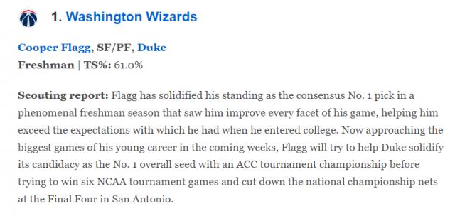 这是最新一期 ESPN 在选秀模拟排名中,弗拉格仍然排名第一。之前有传言说弗拉格会考虑留到杜克再打一个赛季,但是很多专家指出没必要。一些美国媒体表示,如果弗拉格晚一年进入。 NBA,今年的总损失大概是 4500 万美金。