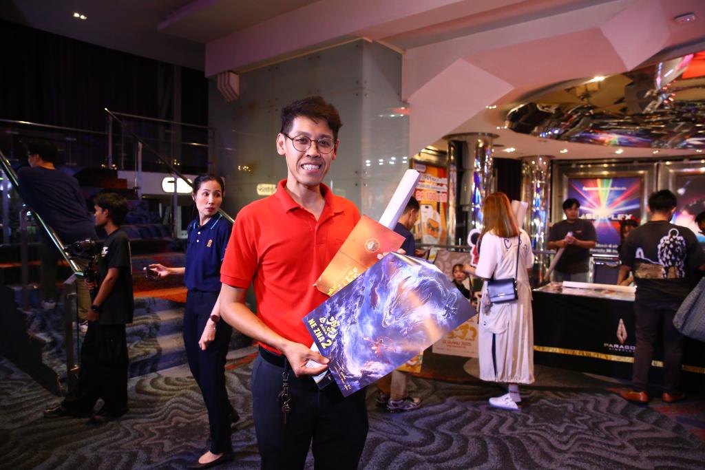 U2003u20033月12日,在泰国曼谷暹罗百丽宫,大学教师差瓦立在《哪吒2》首播活动中向记者展示了他收到的海报。新华社记者 孙玮彤 摄