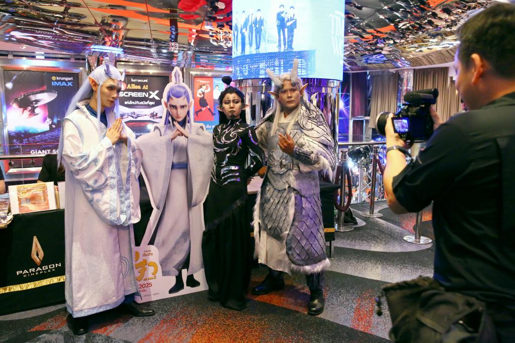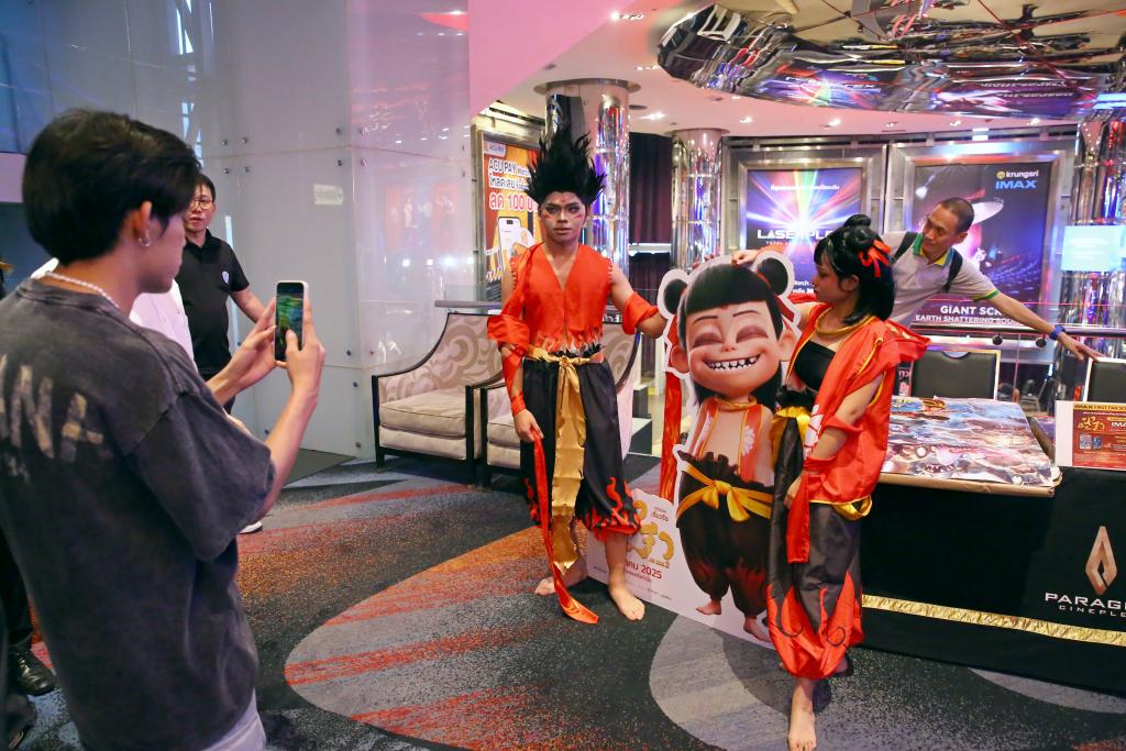 U2003u20033月12日,在泰国曼谷暹罗百丽宫,每个人都扮成了《哪吒2》中的角色,并与电影展板合影。新华社记者 孙玮彤 摄