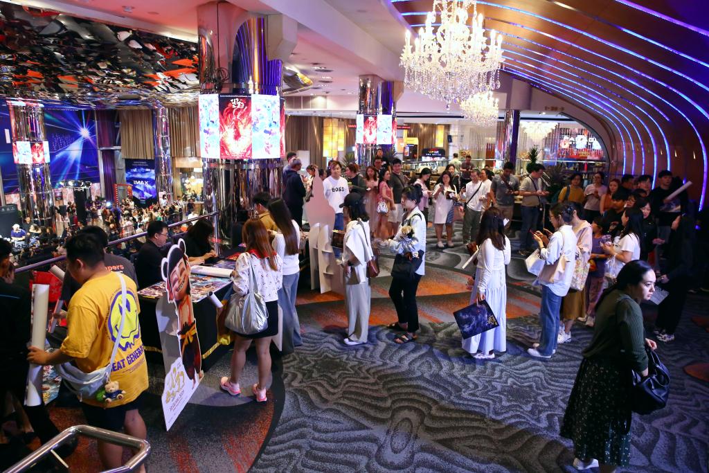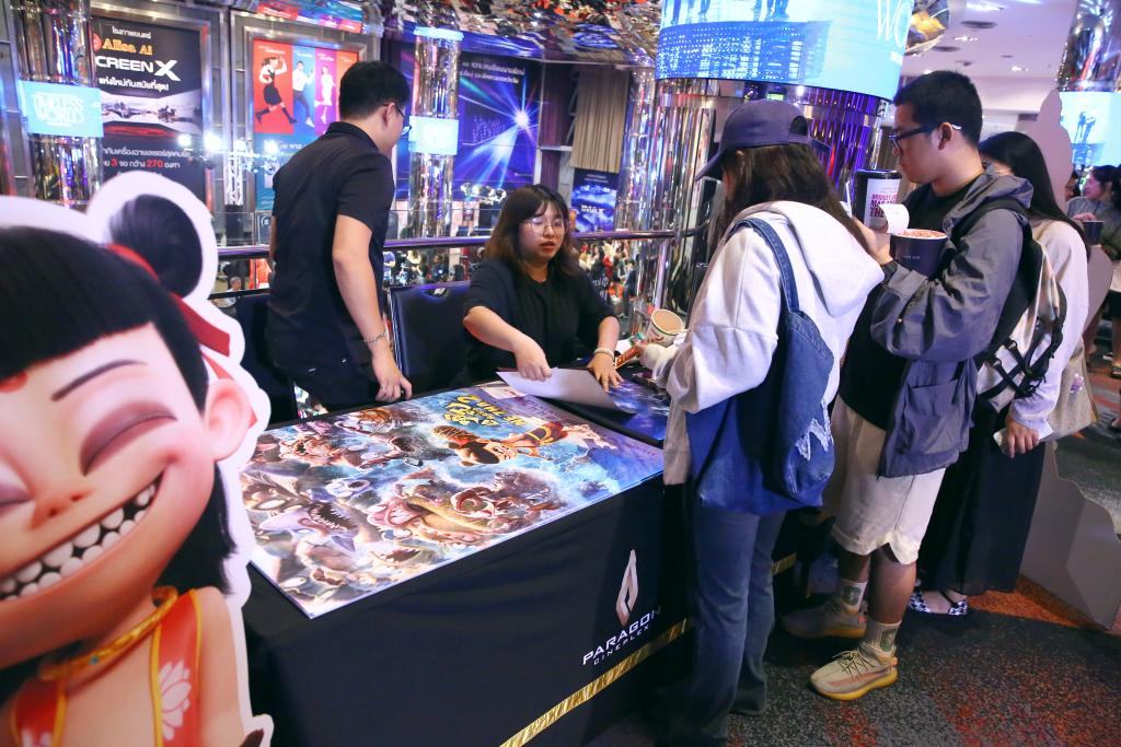 在曼谷百丽宫影城举办首播活动时,记者看到《哪吒2》的海报非常显眼,电影宣传片等内容也在显示屏上播放。很多粉丝在签到&之前排队领取海报。