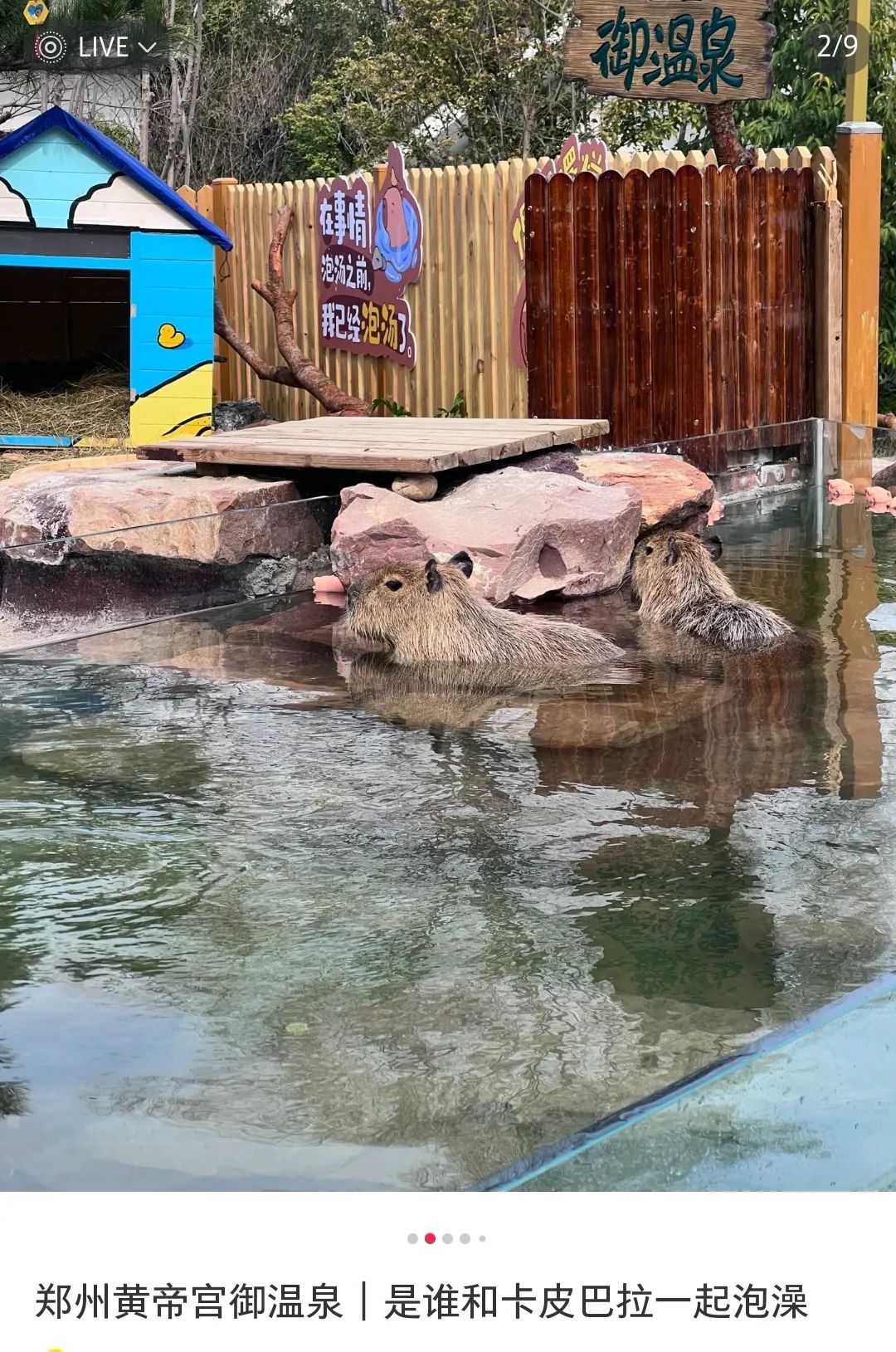 一些汤泉还特别引进了小动物,比如郑州的黄帝宫御温泉,人们可以和卡皮巴拉脸贴脸泡汤,比谁更冷静。