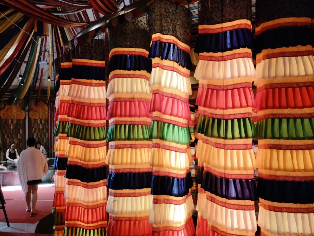 举例来说,陆地游轮西山温泉的藏泉馆,在装修上费尽心思,你需要经过转经筒,绕过经幡才能到达汤池。