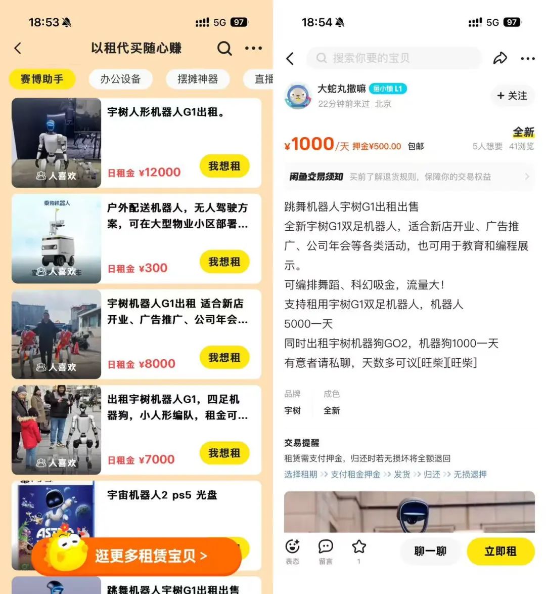 现在,二手交易平台上的“宇树”、“机器人租赁”等关键词的产品数量成倍增加,闲鱼甚至为其设立了专门的交易频道。在这个频道中,除了宇树,还有机器人产品的租赁,如优必选、渠道编程机器人、全自动拉花机器臂等。然而,并不是所有拥有宇树的个人企业都像雷先生一样受欢迎,许多产品页面都标有“可租可售”。