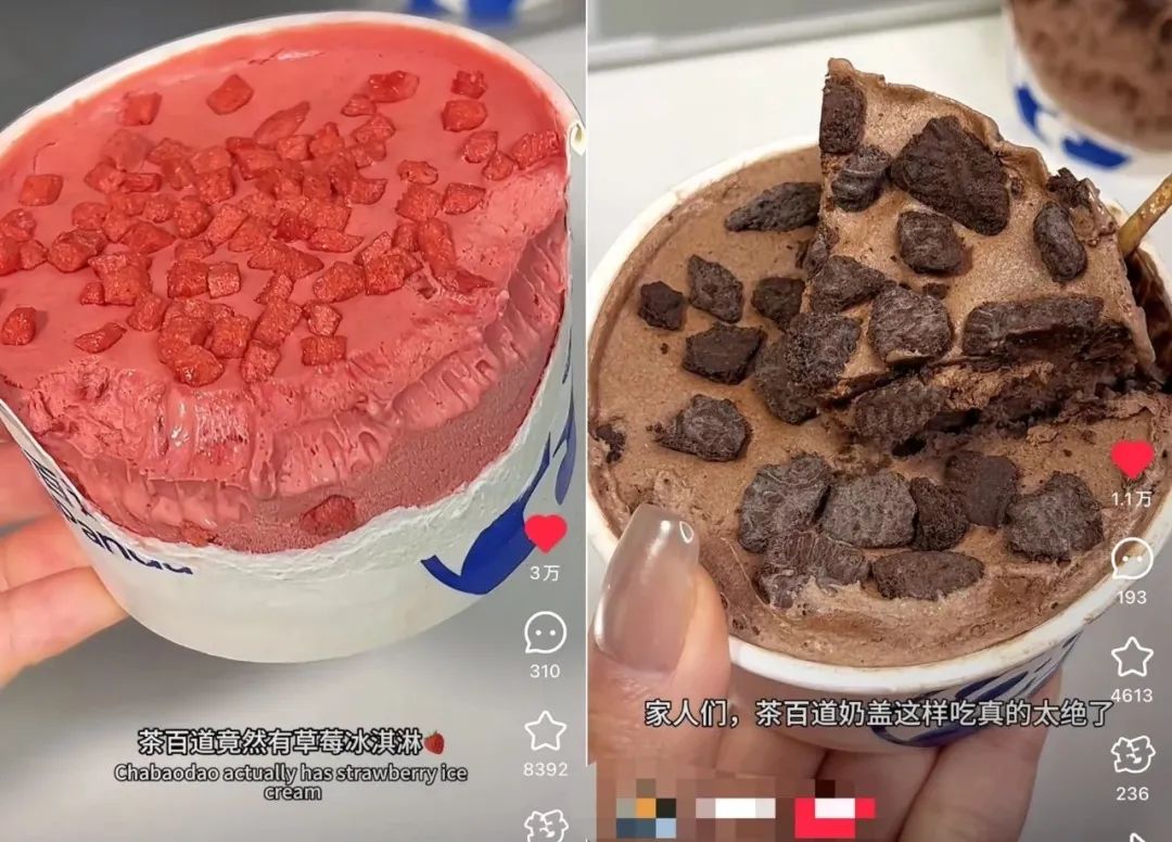 2、自制冰淇淋以喜茶、古茶、茶百种配料成为热门食材。