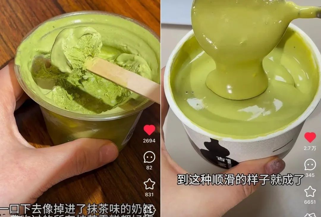 有网友点蜜雪冰城的时候,多点两个奶盖,加抹茶粉搅拌均匀,直到完全融合,再加一个布蕾配料,捣碎搅拌,震动三个小时,放在冰箱里冷冻。抹茶布蕾雪糕就完成了。