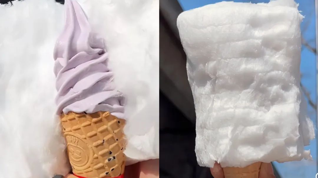 网民首先将棉花糖从中间撕开,然后将蜜雪冰淇淋夹在其中,制成"抹布冰淇淋",得到双倍的甜蜜。