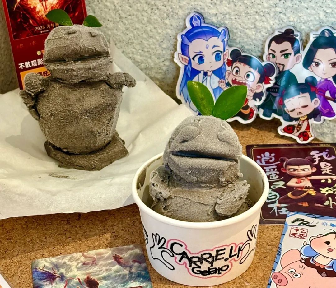 今年,《哪吒魔童闹海》热播,有些商店把冰淇淋做成石矶娘娘的形状。,受到网民的青睐。